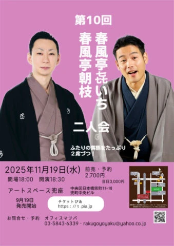 【出演】入船亭扇橋、春風亭朝枝 【木戸銭】2,500円 【お問い合せ】ばばん場 ℡03-6907-0398 Webサイト