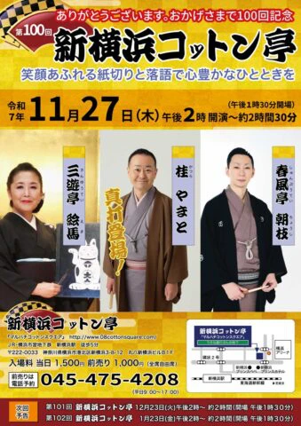 【出演】桂やまと、三遊亭絵馬、春風亭朝枝 【木戸銭】前売り:1,000円 当日:1,500円(全席自由席) 【お問い合せ】マルハチコットンスクエア ℡045-475-4208 Webサイト