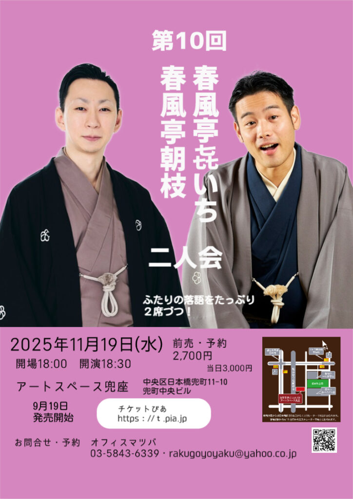 【出演】春風亭㐂いち、春風亭朝枝 【木戸銭】ご予約:2,700円 当日:3,000円 【お問い合せ】℡03-5843-6339 オフィスマツバ rakugoyoyaku@yahoo.co.jp Webサイト