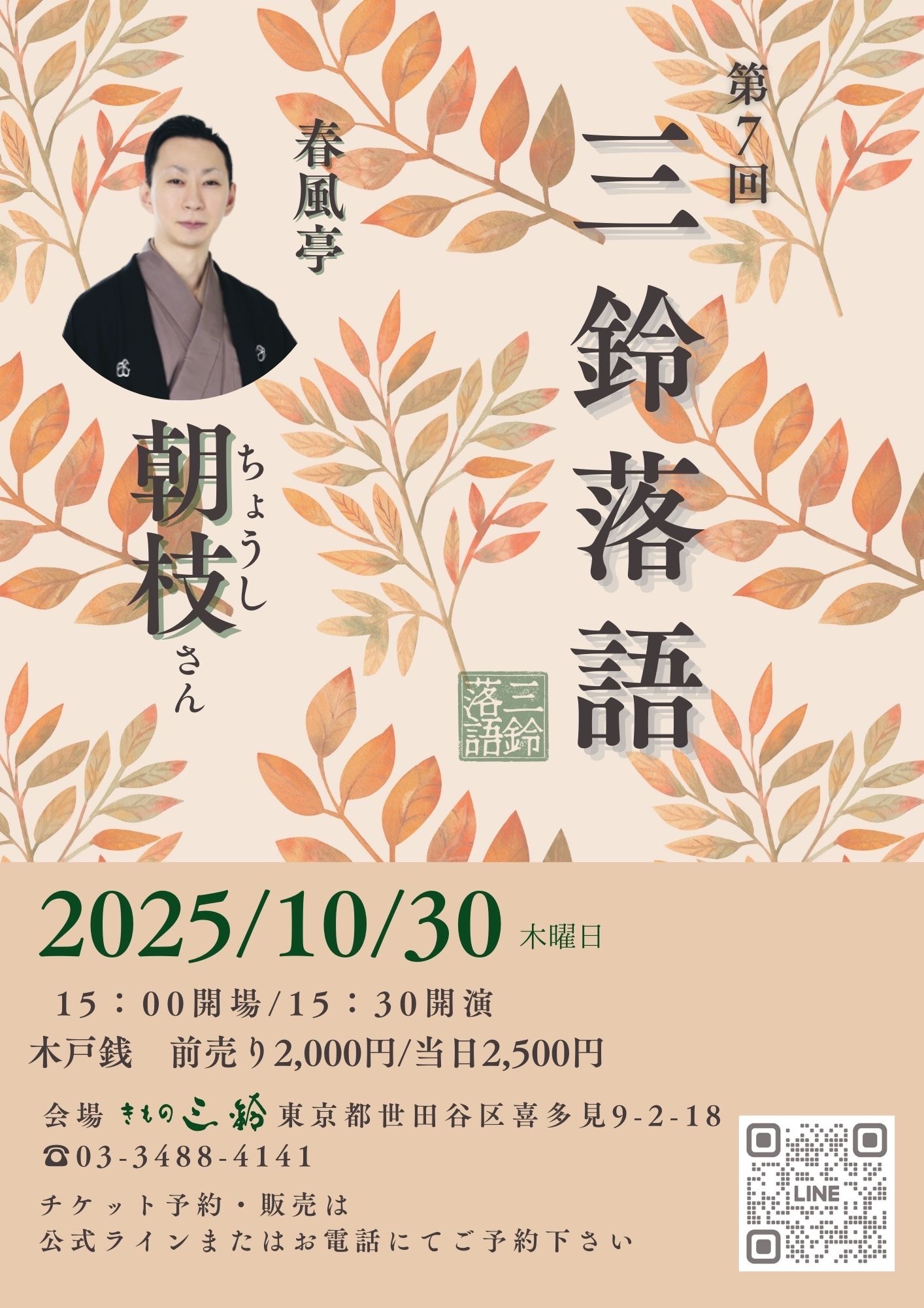 【出演】春風亭朝枝 【木戸銭】前売り:2,000円 当日:2,500円 【お問い合せ】きもの三鈴 ℡03-3488-4141 Webサイト