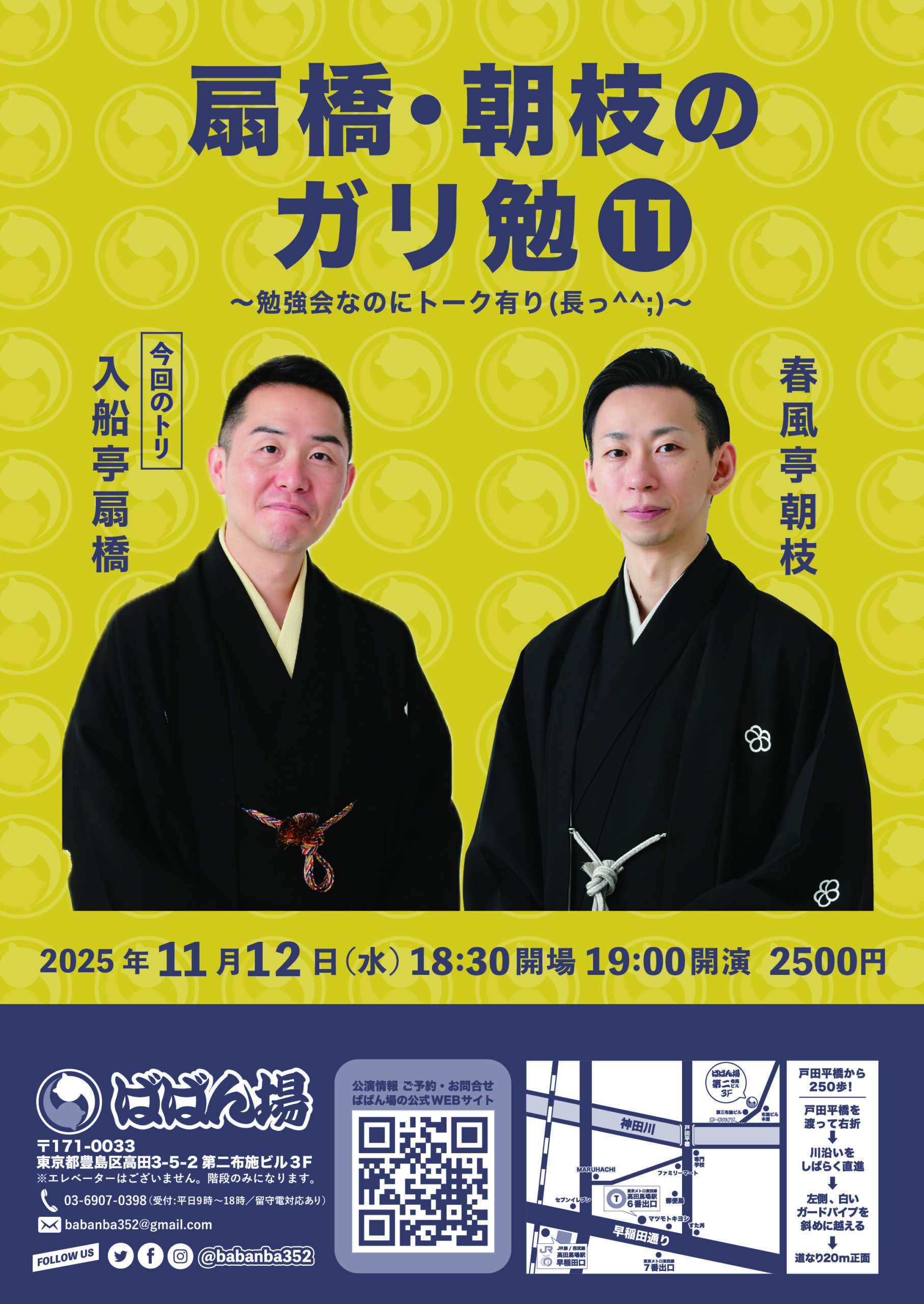 【出演】入船亭扇橋、春風亭朝枝 【木戸銭】2,500円 【お問い合せ】ばばん場 ℡03-6907-0398 Webサイト