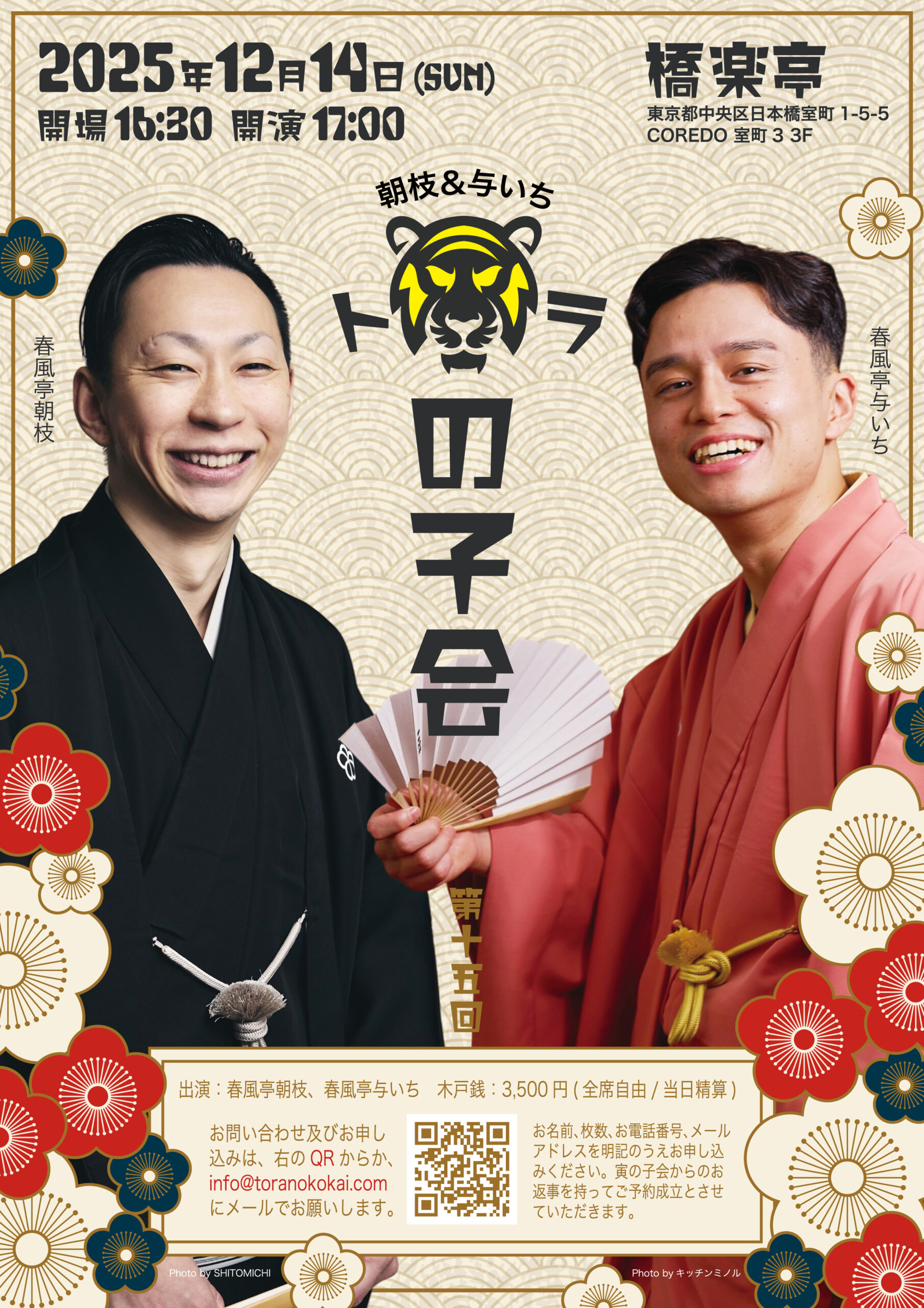 【出演】春風亭朝枝、春風亭与いち 【木戸銭】3,500円 *全席自由 【お問い合せ】前田 ℡ info@toranokokai.com Webサイト