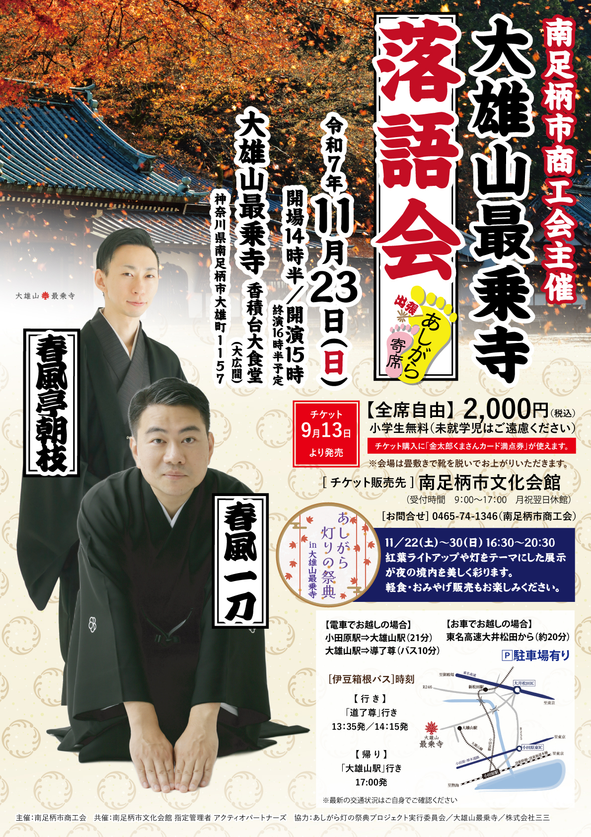 【出演】春風一刀、春風亭朝枝【木戸銭】2,000円 【お問い合せ】南足柄市商工会 ℡0465-74-1346 Webサイト