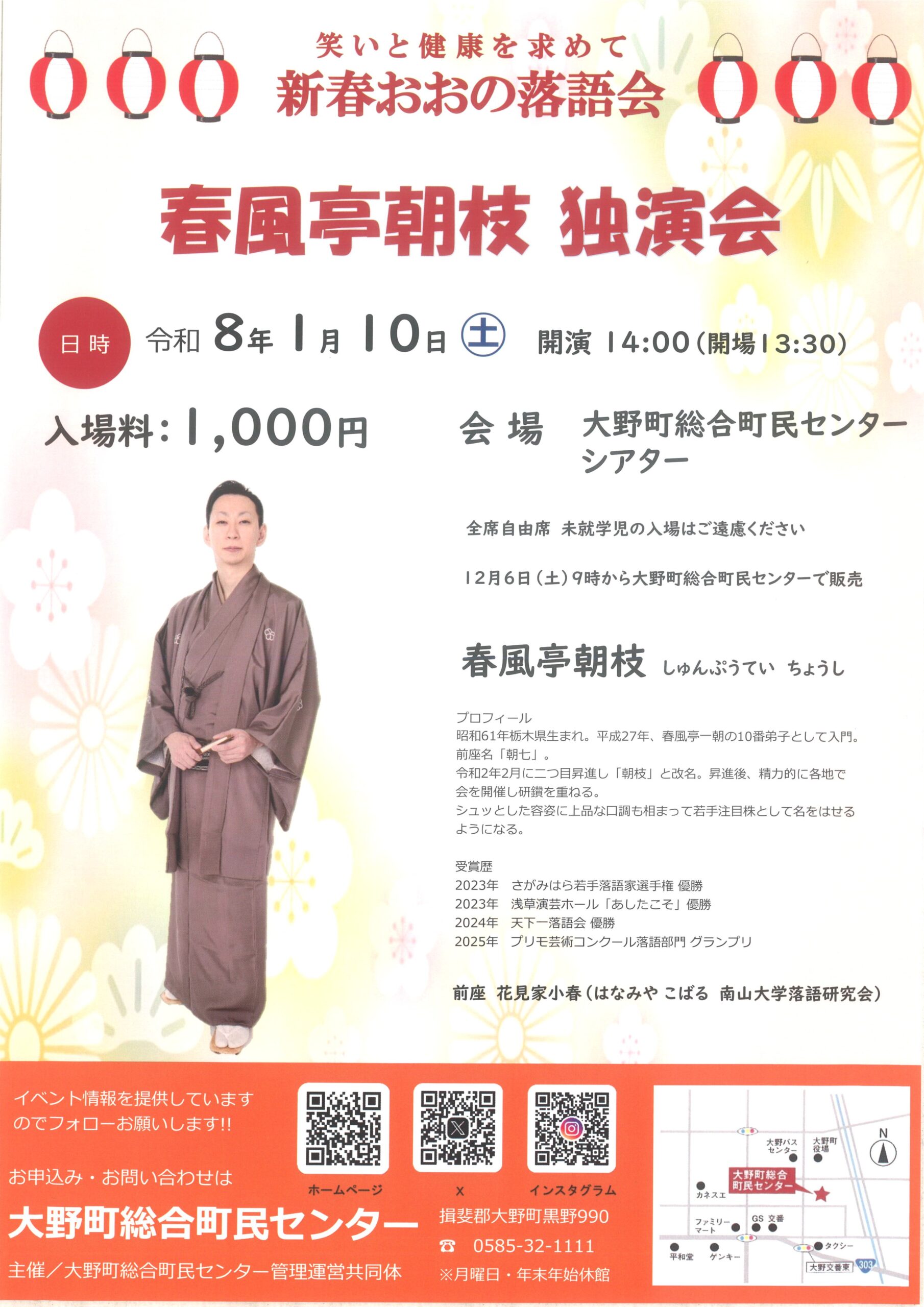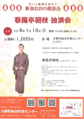 【出演】春風亭朝枝、花見家小春(南山大学落語研究会) 【木戸銭】1,000円 【お問い合せ】大野町総合町民センター ℡0585-32-1111 Webサイト