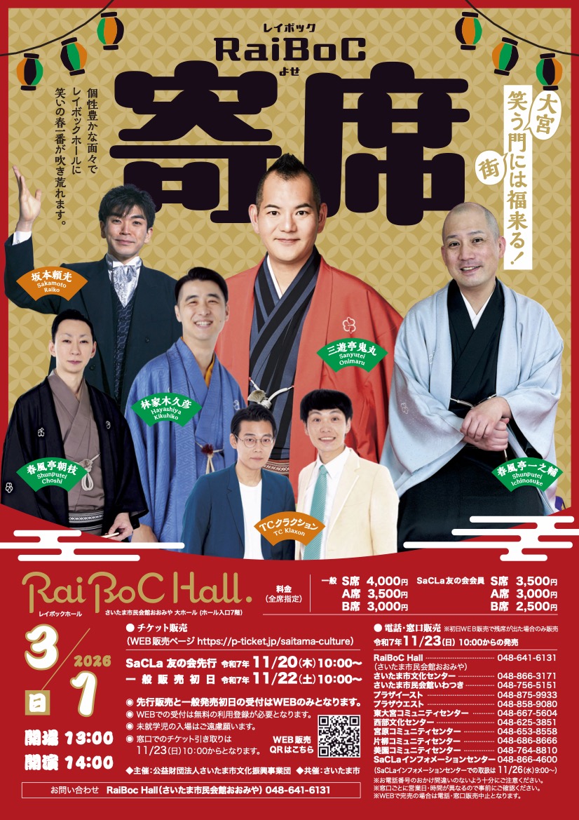 【出演】三遊亭鬼丸、春風亭一之輔、坂本頼光、林家木久彦、春風亭朝枝、TCクラクション 【木戸銭】チケット料金:S席 4,000円 A席 3,500円 B席 3,000円 【お問い合せ】SaCLaインフォメーションセンター ℡048-866-4600 Webサイト