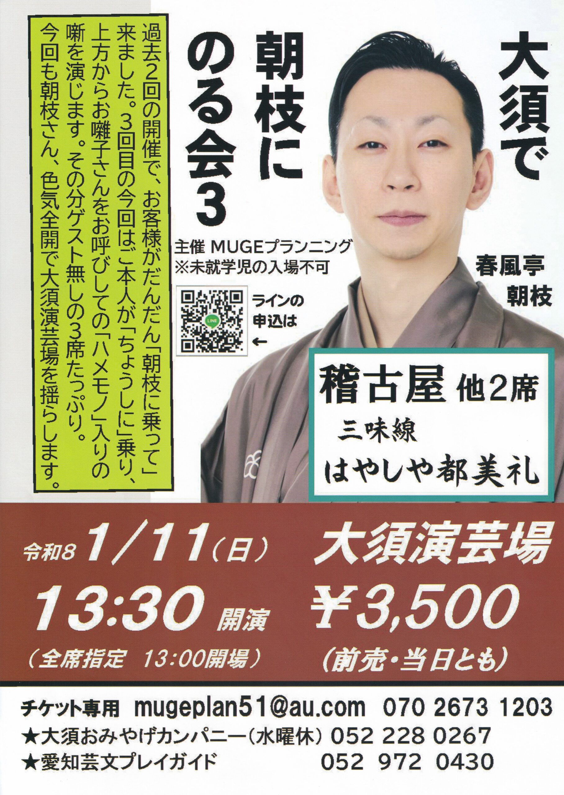 【出演】春風亭朝枝「稽古屋、他」 三味線:はやしや都美礼 【木戸銭】3,500円 【お問い合せ】MUGEプランニング ℡070-2673-1203 mugeplan51@au.com Webサイト
