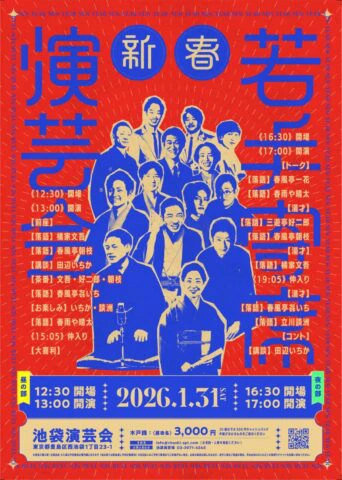 【出演】《落語》橘家文吾、春風亭㐂いち、春雨や晴太、春風亭朝枝 《講談》田辺いちか 《茶番》橘家文吾、春風亭朝枝、三遊亭好二郎 《お楽しみ》田辺いちか、立川談洲 《大喜利》一同【木戸銭】3,000円 【問い合わせ】池袋演芸場 ℡03-3971-4545 info@choshi-spt.com Webサイト