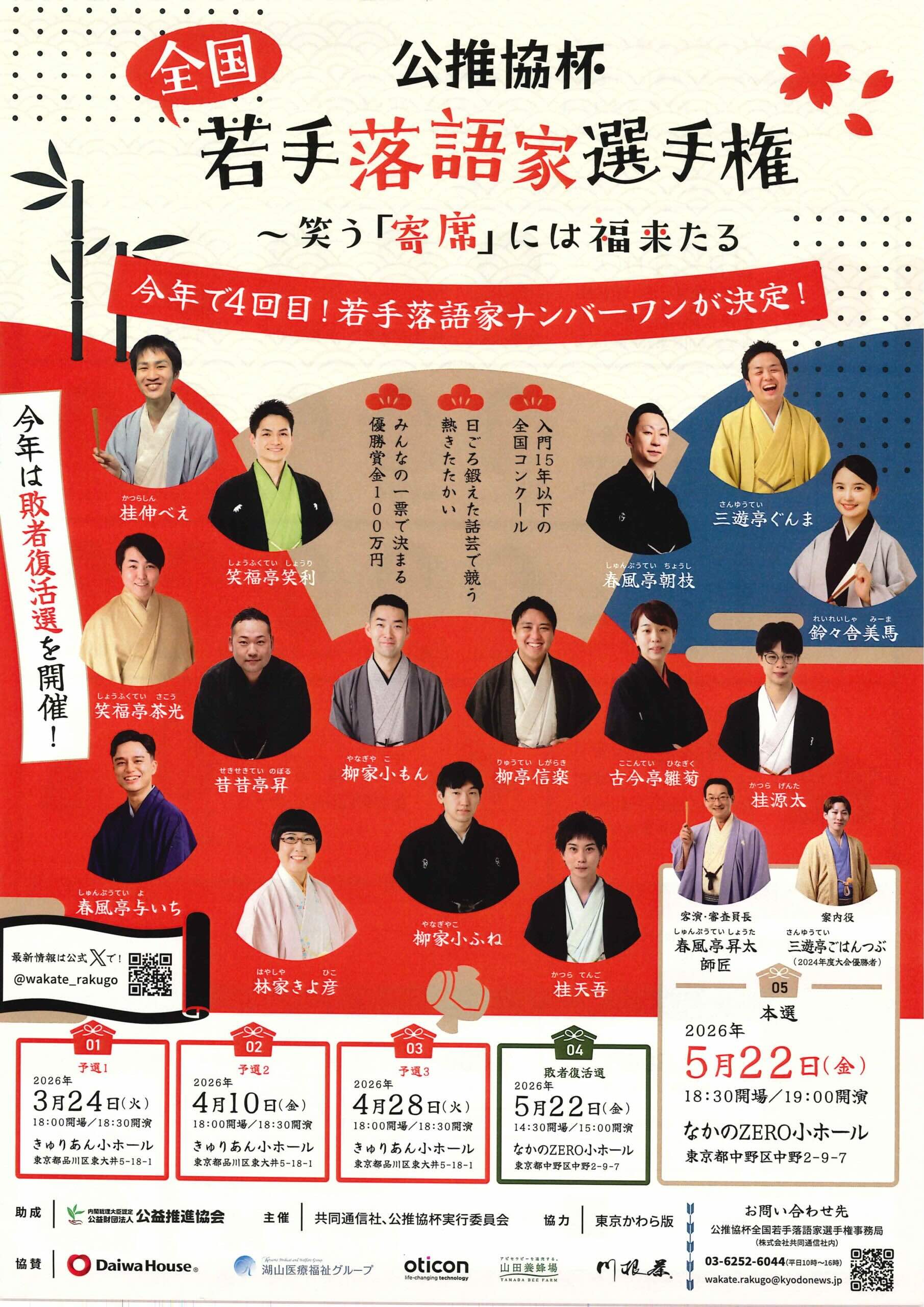 【出演】春風亭朝枝、三遊亭ぐんま、古今亭雛菊、鈴々舎美馬、桂源太 【木戸銭】前売り:2,500円 当日:3,000円 【問い合わせ】全国若手落語家選手権事務局 ℡03-6252-6044 wakate-rakugo@kyodonews.jp Webサイト