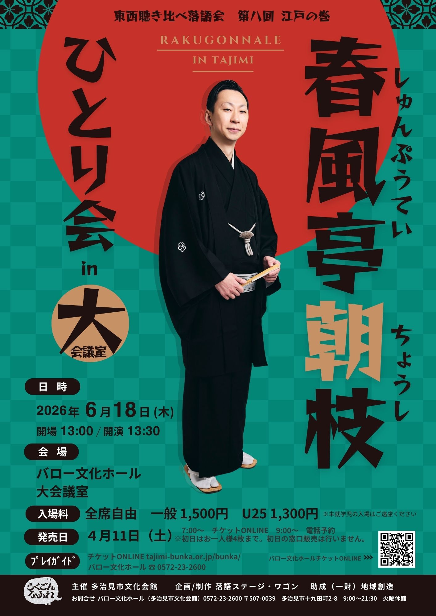 【出演】春風亭朝枝 【料金】一般ご予約:1,500円(当日:2,000円) U25 ご予約:1,200円(当日:1,500円) 【お問い合せ】バロー文化ホール℡0572-23-2600 Webサイト