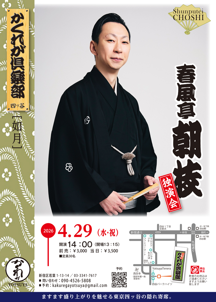 【出演】春風亭朝枝 【木戸銭】予約:3,000円 当日:3,500円 【お問い合せ】四ツ谷かくれが倶楽部 ℡090-4526-5808 kakuregayotsuya@gmail.com