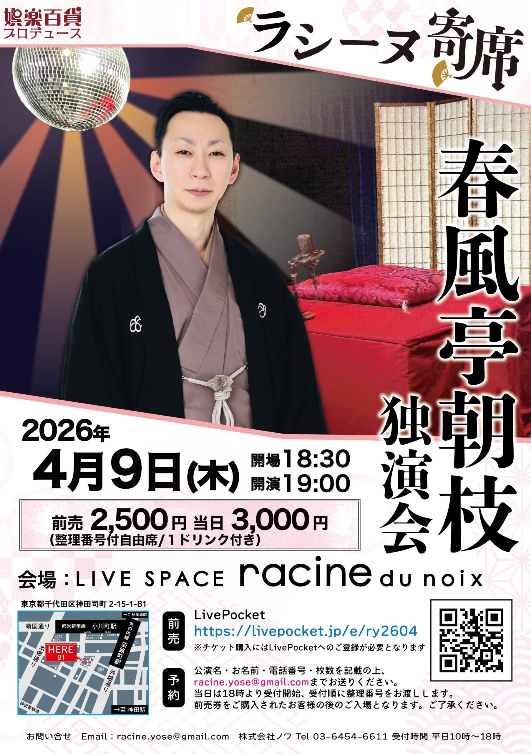 【出演】春風亭朝枝 【木戸銭】前売り:2,500円 当日:3,000円 【お問い合せ】株式会社ノワ ℡03-6454-6611 racine.yose@gmail.com