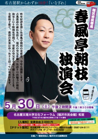 【出演】春風亭朝枝 【木戸銭】2,000円 【お問合せ】名古屋文理大学文化フォーラム(稲沢市民会館)℡0587-24-5111 Webサイト