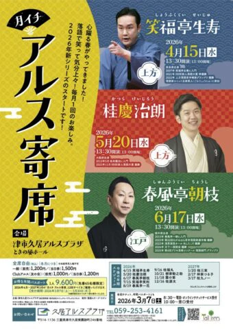 【出演】春風亭朝枝【木戸銭】一般前売:1,200円 当日:1,500円 Clubアルス(友の会)前売:1,000円 当日:1,200円 問い合わせ:津市久居アルスプラザ℡059-253-4161 Webサイト