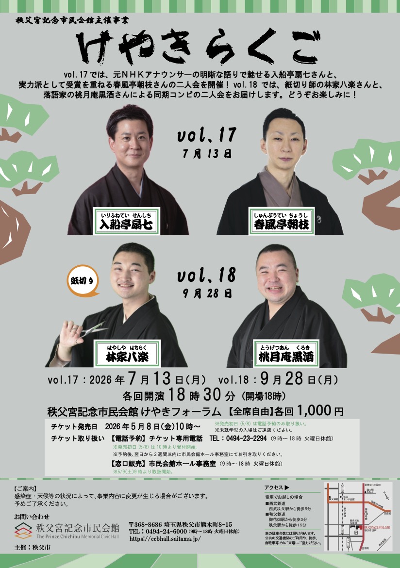 【出演】春風亭朝枝、入船亭扇七 【木戸銭】1,000円 【お問い合せ】秩父宮記念市民会館 ℡0494-24-6000 Webサイト