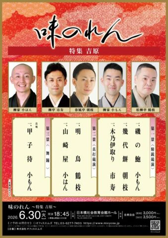 【出演】春輔「山崎屋」、 小満ん「傾城瀬川」 、小里ん「三人兄弟」 、朝枝「稽古屋」 、枝次「突き落とし」【木戸銭】4,000円 全席指定 【お問い合せ】オフィスエムズ ℡03-6277-7403 yoyaku@mixyose.jp Webサイト